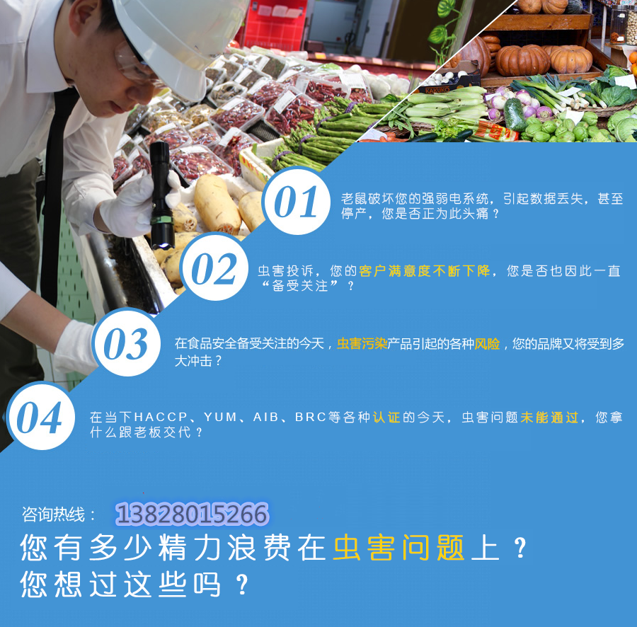服務范圍: 針對工廠、寫字樓、辦公室、家庭住宅、賓館、酒店、餐廳、超市、商鋪、銀行、醫院、招待所、商場、圖書館、歌舞廳、集體宿舍、旅店、學校、網吧、儲倉及食品飲料加工廠、衛生用品廠、精密儀器制造企業、高級酒店、高檔寫字樓、大型工廠、私家家庭、各種場所等滅鼠、滅蟑螂、滅蚊、滅蒼蠅、滅白蟻、滅跳蚤等蟲害服務.